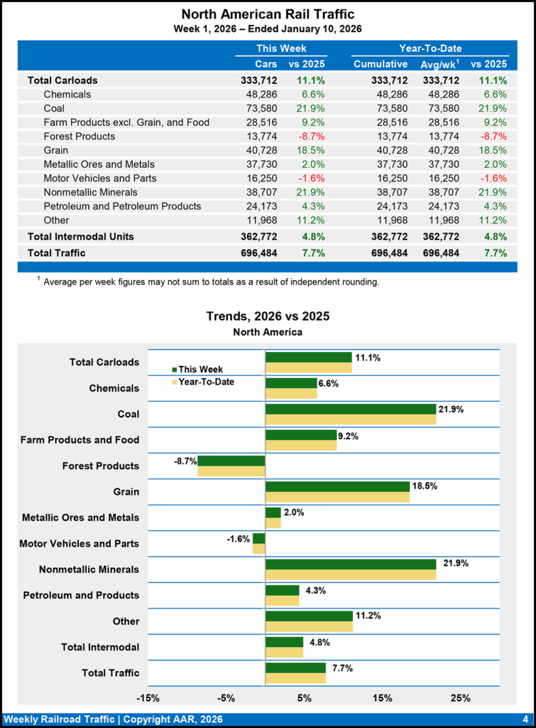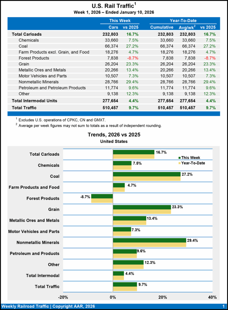 For the first week of 2026 (ending Jan. 10), U.S. Class I railroads carried 232,803 carloads, up 16.7% compared with the same week in 2025, and 277,654 containers and trailers, up 4.4% percent compared with 2025, according to the AAR.