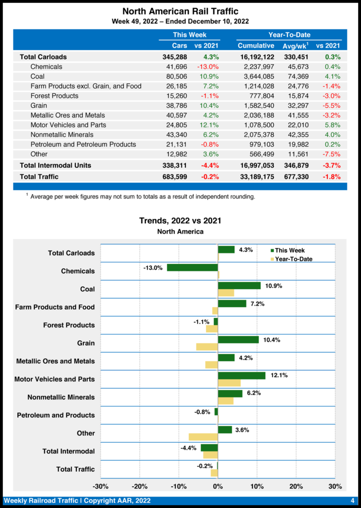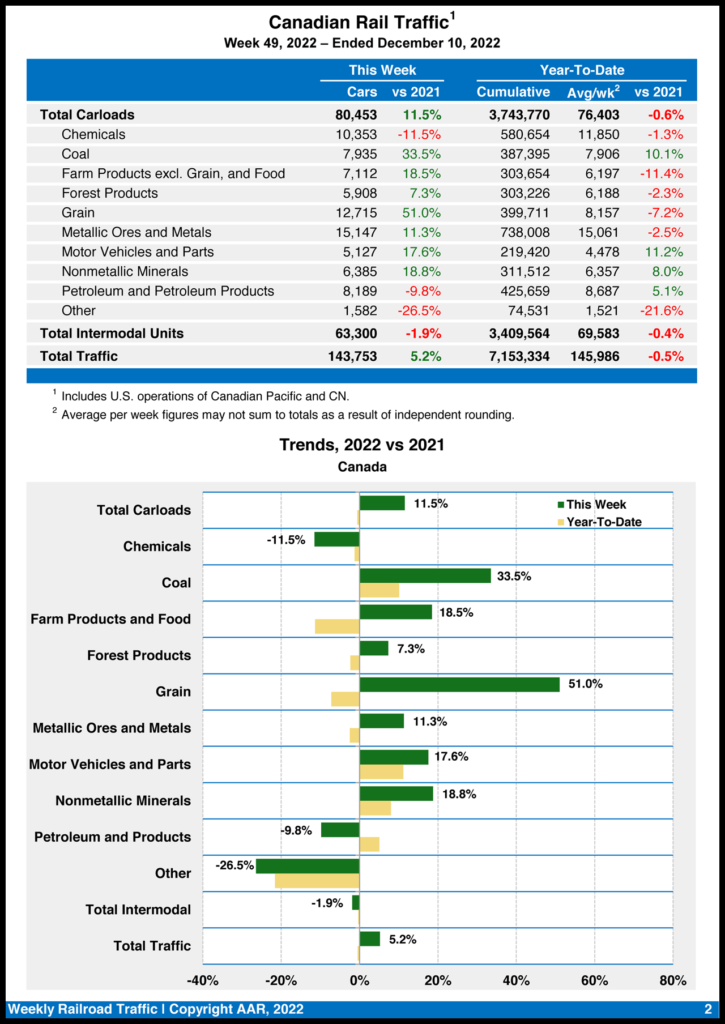 Canadian railroads reported 80,453 carloads for the week ending Dec. 10, 2022, increasing 11.5%, and 63,300 intermodal units, dipping 1.9% compared with the same week last year. For the first 49 weeks of 2022, they reported cumulative rail traffic volume of 7,153,334 carloads, containers and trailers, down 0.5%.