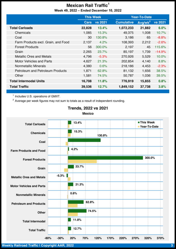 For the week ending Dec. 10, 2022, Mexican railroads reported 22,828 carloads, a 13.4% gain over the same week last year, and 16,708 intermodal units, a 11.8% rise. Their cumulative volume for the first 49 weeks of this year was 1,849,152 carloads and intermodal containers and trailers, up 3.8% from the same point in 2021.