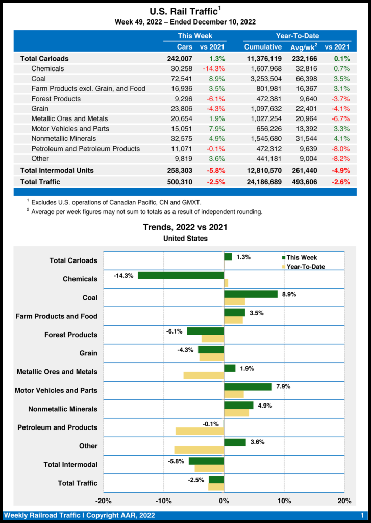 For the week ending Dec. 10, 2022 (Week 49), total U.S. rail traffic was down 2.5% over the same week last year; carloads came in 1.3% higher while intermodal volume continued its downward trend, dipping 5.8%, according to the Association of American Railroads’ (AAR) Dec. 14 report.