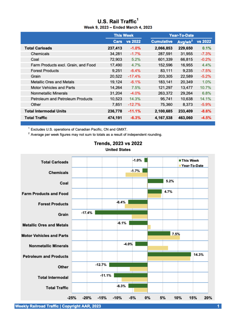 U.S. rail traffic for the week ending March 4, 2023 (Week 9) dipped 6.3% from the same week last year, the Association of American Railroads (AAR) reported Feb. 22.