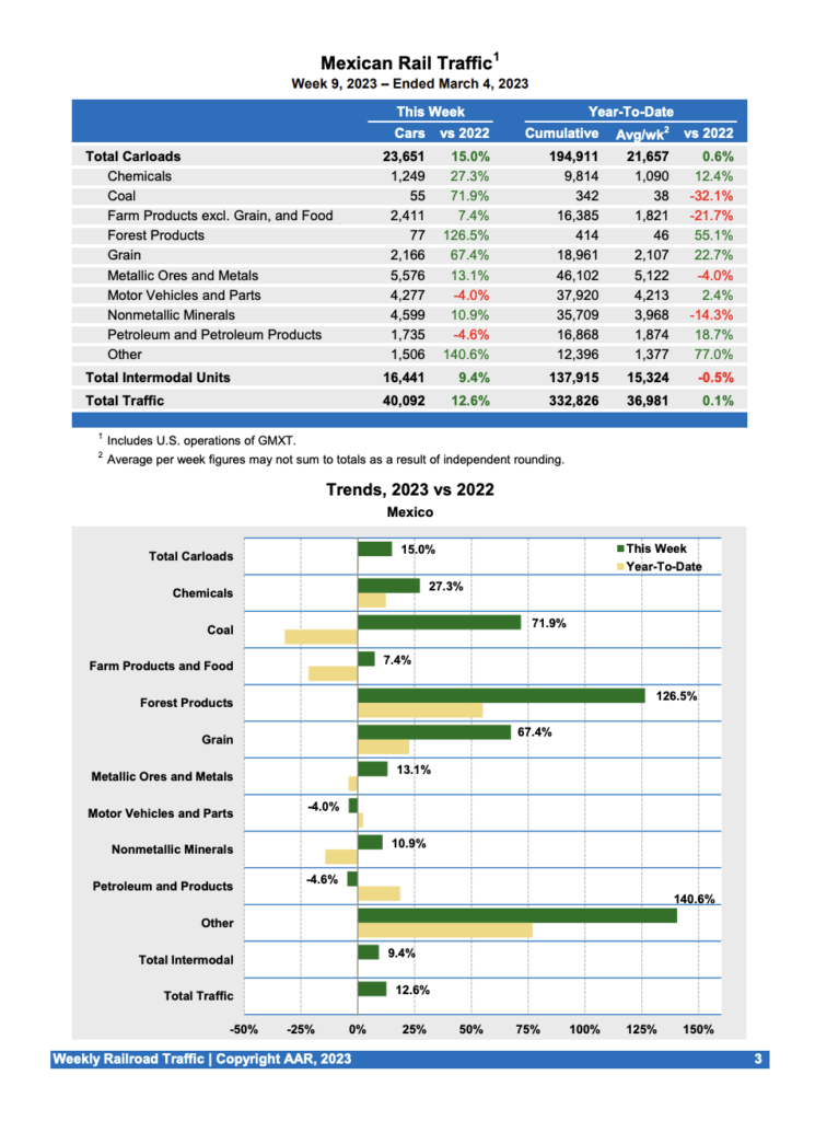Mexican railroads reported 23,651 carloads for the week, up 15.0% compared with the same week last year, and 16,441 intermodal units, up 9.4%. Cumulative volume on Mexican railroads for the first nine weeks of 2023 was 332,826 carloads and intermodal containers and trailers, up 0.1% from the same point last year.