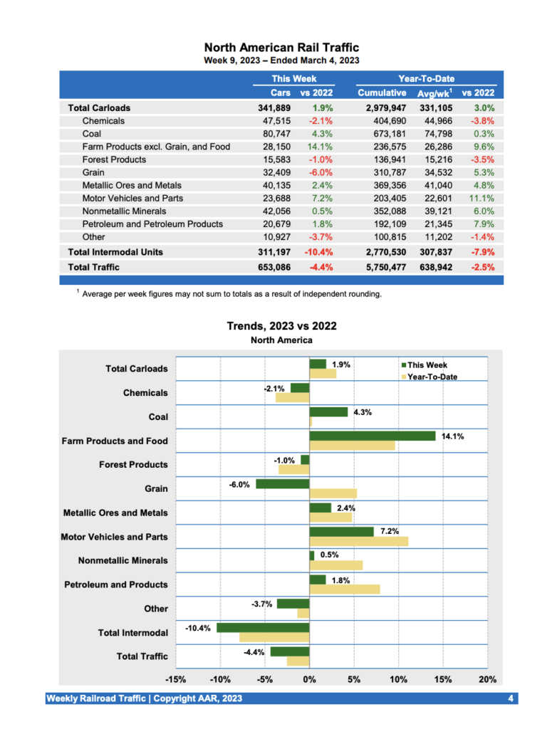 For the first nine weeks of 2023, U.S. railroads reported cumulative volume of 2,066,853 carloads, up 0.1% from the same point last year; and 2,100,685 intermodal units, down 8.6% from last year. Total combined U.S. traffic for the first nine weeks of 2023 was 4,167,538 carloads and intermodal units, a decrease of 4.5% compared to last year.