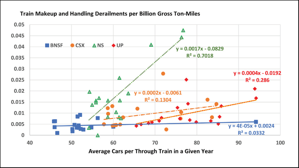 The second time I read the report, I was struck by the same two things, but I had developed at least part of an explanation. Regarding NS, clearly what was driving the derailment rate could not be attributed to increased average train size, as the rates on NS were so much higher even when the average cars per train were just 60% of the current average.