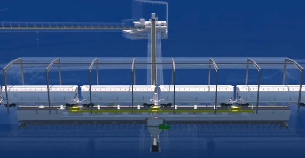 At full operation, 193-car trains will have “a 24-hour unloading and release cycle,” according to HDR. The Port of Stockton says that trains will average 0.25 mph through the unloading building, where hopper car gates will be opened automatically for load discharge. HDR says the Infinity Loop track layout also accommodates “ground level roadway access to both ‘lobes’ (interior areas of the loop) of the Infinity while a train is being processed, with no grade separation overpass or underpass required.”