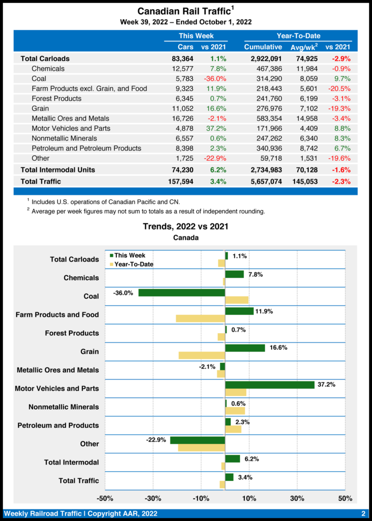Canadian railroads reported 83,364 carloads for the week ending Oct. 1, 2022, up 1.1%, and 74,230 intermodal units, up 6.2% from same week last year. For the first 39 weeks of 2022, they reported cumulative rail traffic volume of 5,657,074 carloads, containers and trailers, down 2.3%.