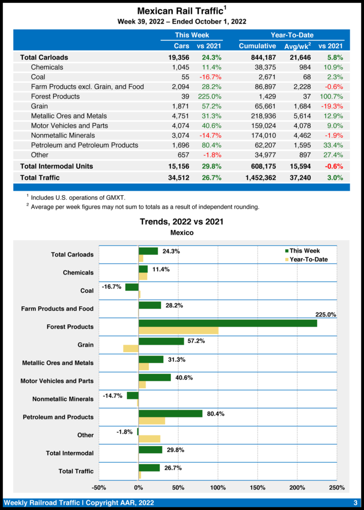 Mexican railroads reported 19,356 carloads for the week ending Oct. 1, 2022, gaining 24.3% compared with the same week last year, and 15,156 intermodal units, rising 29.8%. Their cumulative volume for the first 39 weeks of 2022 was 1,452,362 carloads and intermodal containers and trailers, up 3% from prior-year period.