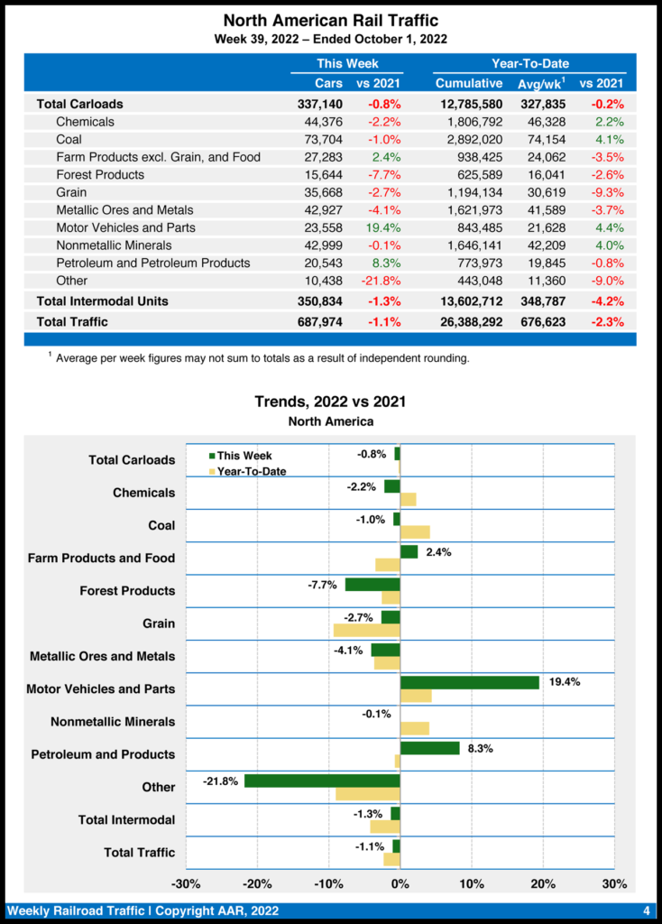 Total combined U.S. traffic for the first 39 weeks of this year was 19,278,856 carloads and intermodal units, a 2.7% decrease from 2021.