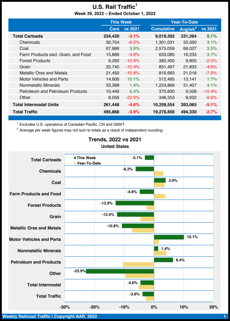 Total carloads for the week ending Oct. 1, 2022, came in at 234,420, down 3.1% from the year-earlier period, while U.S. weekly intermodal volume was 261,448 containers and trailers, down 4.6% from 2021.