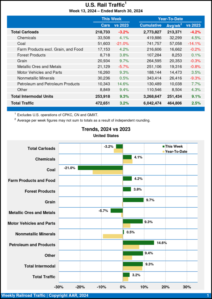 For the week ending March 30, 2024, eight of the 10 carload commodity groups posted an increase compared with the same week last year. They included grain, up 1,849 carloads, to 20,934; motor vehicles and parts, up 1,387 carloads, to 16,260; and chemicals, up 1,319 carloads, to 33,508. Commodity groups that posted decreases were coal, down 13,750 carloads, to 51,603; and metallic ores and metals, down 1,279 carloads, to 21,129.