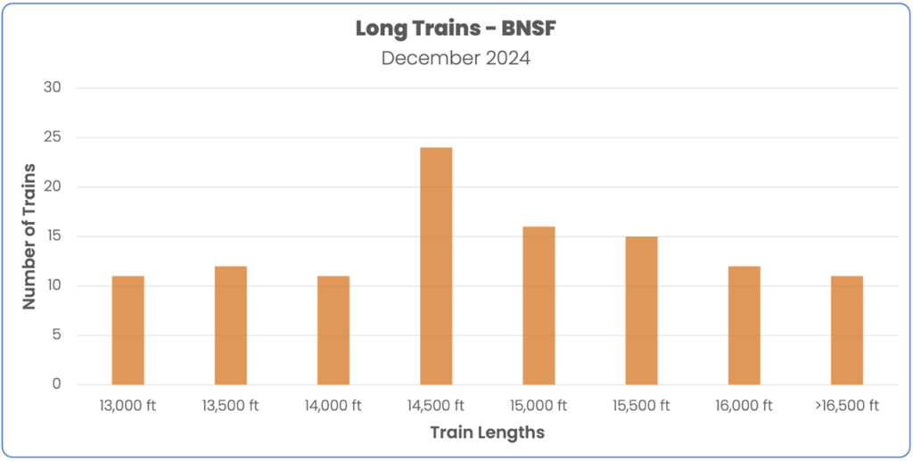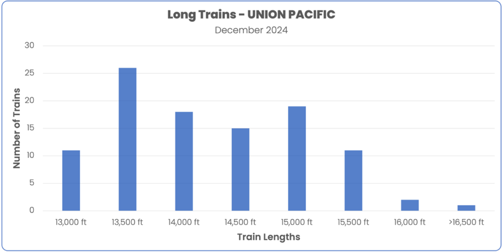 According to industry reports, only 1% of trains operated in the U.S. are longer than 14,000 feet.  A review of trains measured by RailState in the U.S. Southwest in December 2024 showed much higher percentages of very long trains in that part of the rail network.