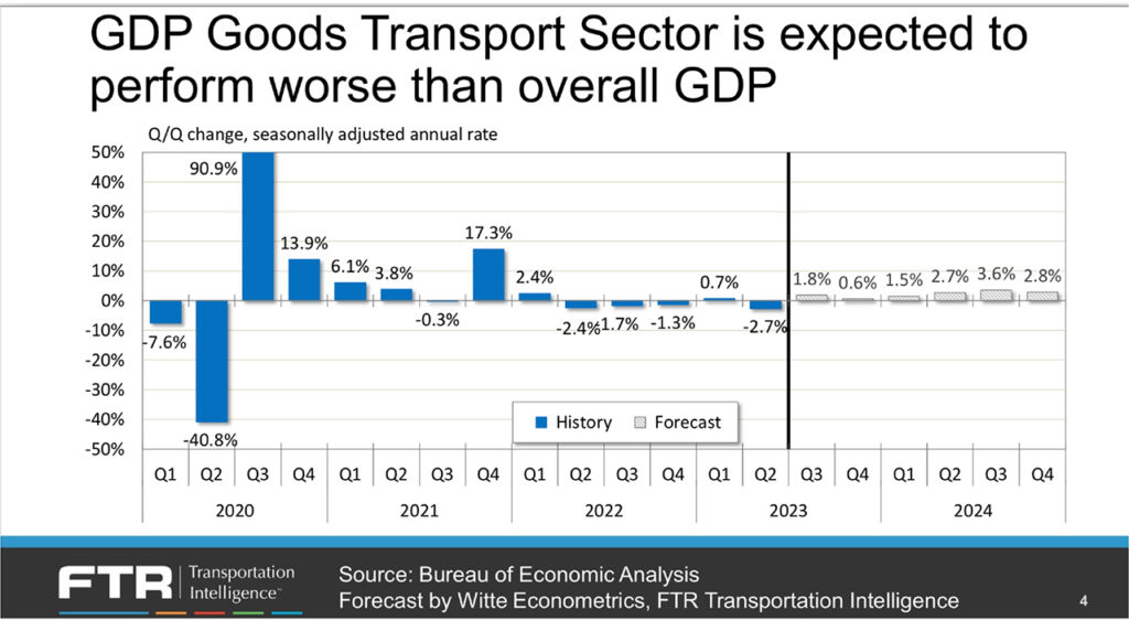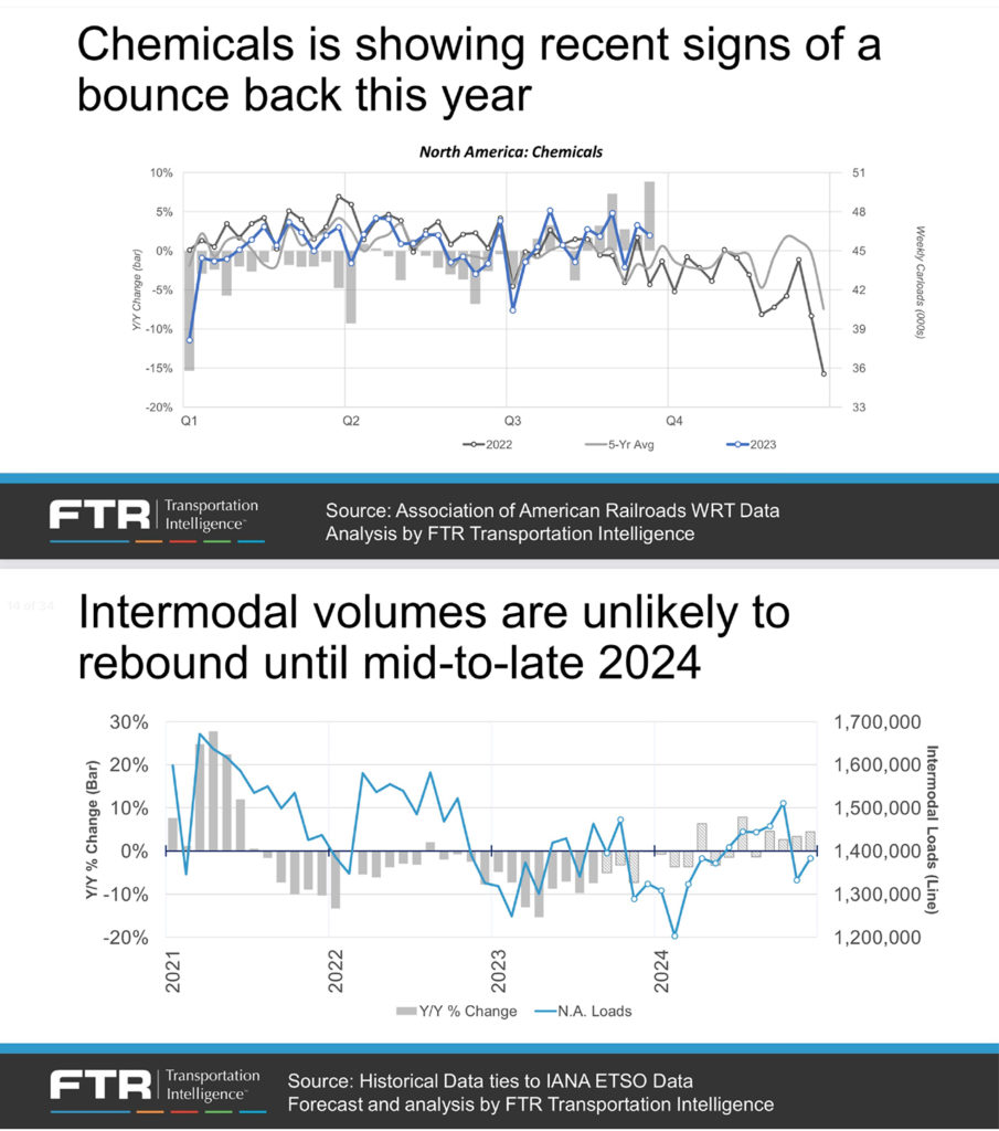 - Rail mixed general cargo traffic volumes are surprisingly good—not fully recovered, but certainly higher than expected. As of third-quarter 2023, they’re performing better than the long-favored intermodal rail sector.