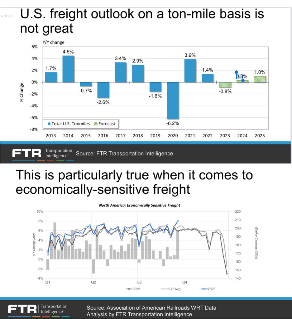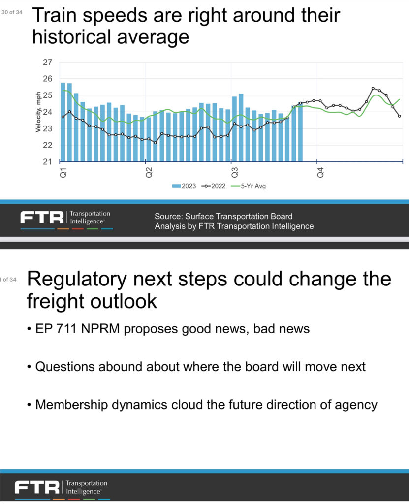 Jim Blaze reporting on the NEARS (Northeast Association of Rail Shippers) Fall 2023 Conference: FTR Transportation Intelligence Vice President Rail and Intermodal Todd Tranausky and his colleagues conduct high-quality research. They are one of my recommended (and depended upon) independent freight intelligence observers and reporters I recommend and use for monitoring and trying to predict railroad competitive market forces.