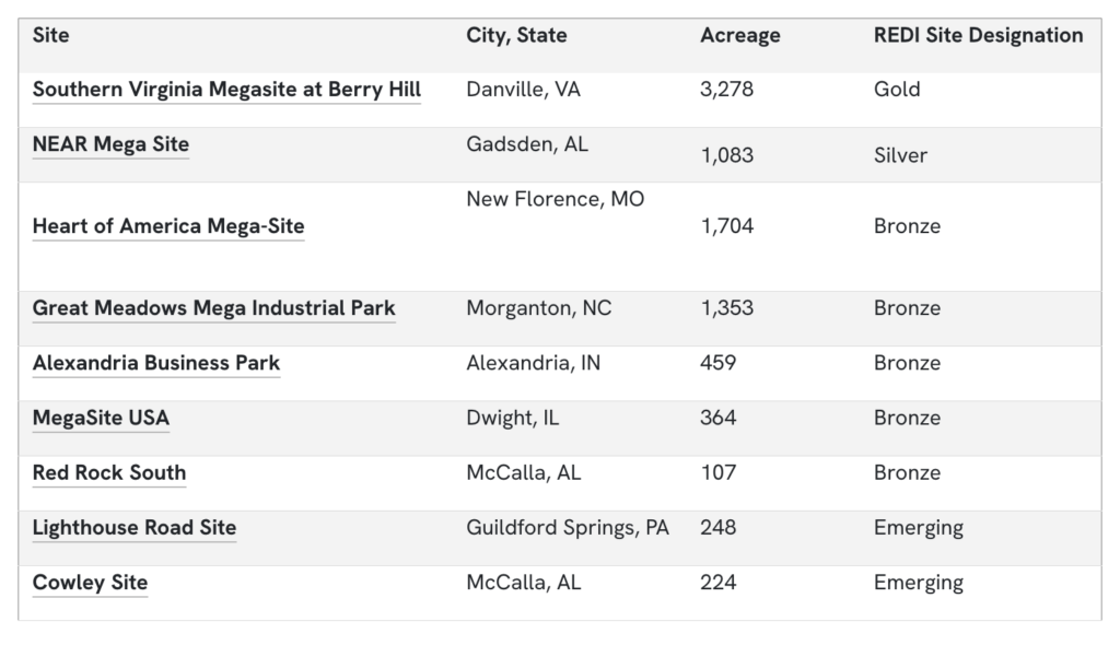 Launched in 2024, the REDI Sites program standardizes an assessment process that has historically varied across municipalities and states. It provides site selection consultants with fast access to project-ready sites through an exclusive nationwide database. The program evaluates factors, such as infrastructure capacity, ease of development, ownership, and entitlements. Sites receive one of five designations based on the program criteria: platinum, gold, silver, bronze, or emerging.