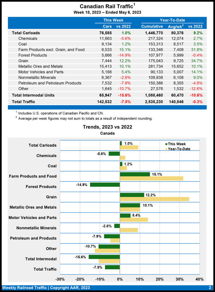 Canadian railroads reported 76,585 carloads for the week, rising 1.0%, and 65,947 intermodal units, dropping 15.6% from the same period in 2022.