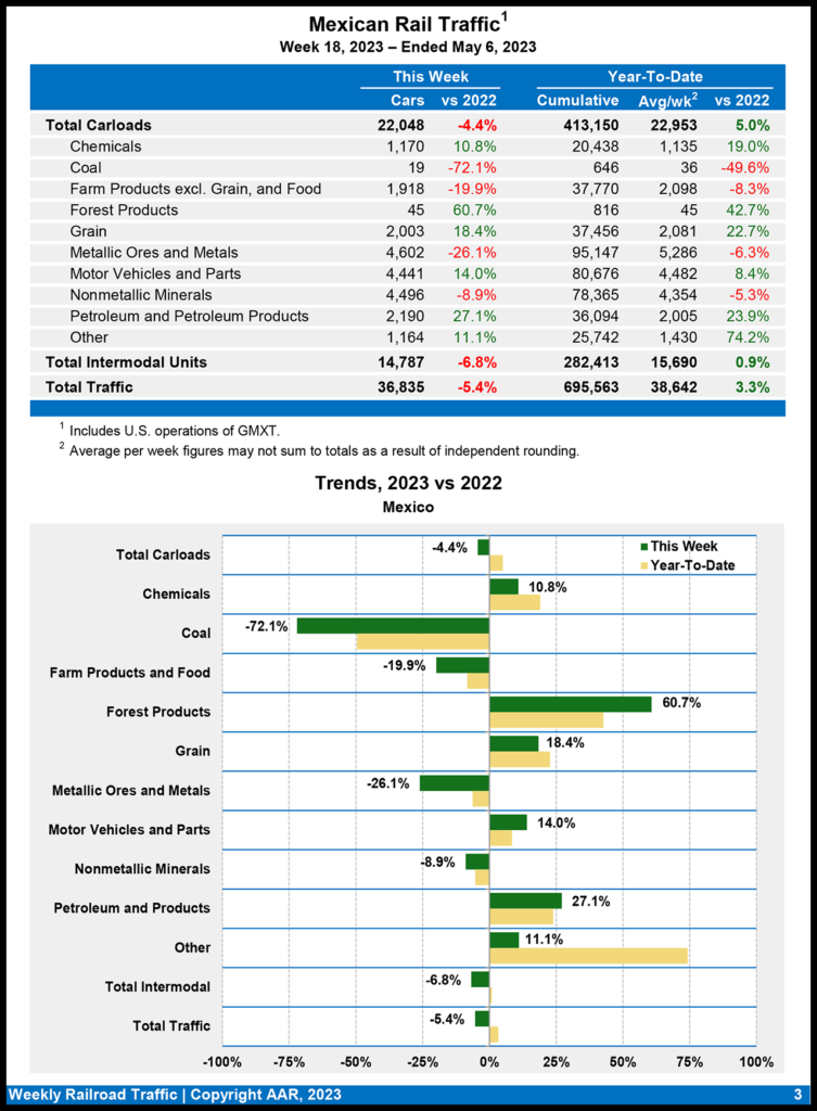 Mexican railroads reported 22,048 carloads for the week, a 4.4% decrease compared with the same week in 2022 and 14,787 intermodal units, a 6.8% decrease.