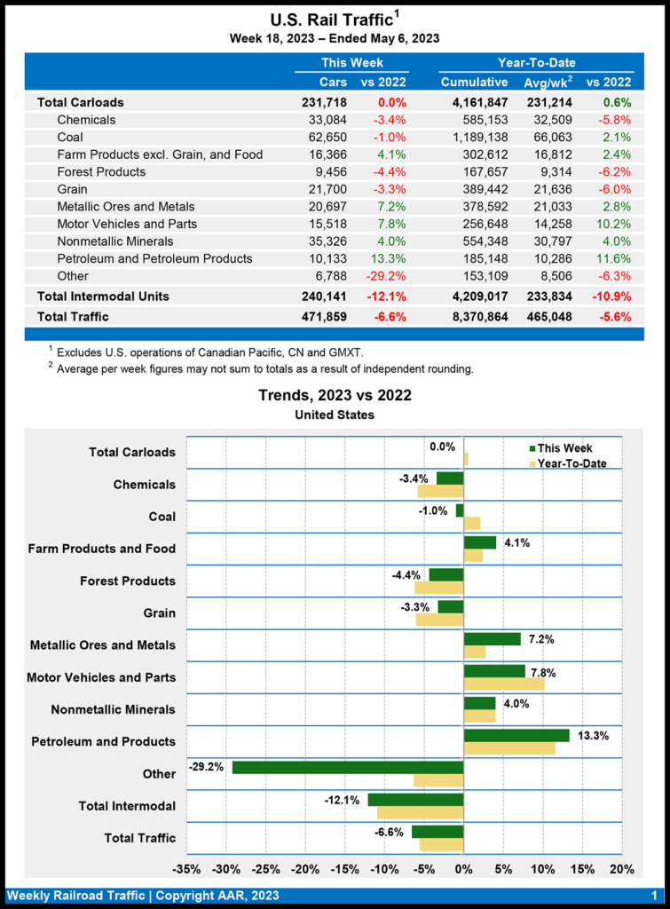According to the AAR, for the week ending May 6, 2023, U.S. Class I railroads carried a total of 471,859 carloads and intermodal units, falling 6.6% from the same week last year. This comprises 231,718 carloads—down 0.04% from the prior-year period—and 240,141 containers and trailers—down 12.1% compared with 2022.