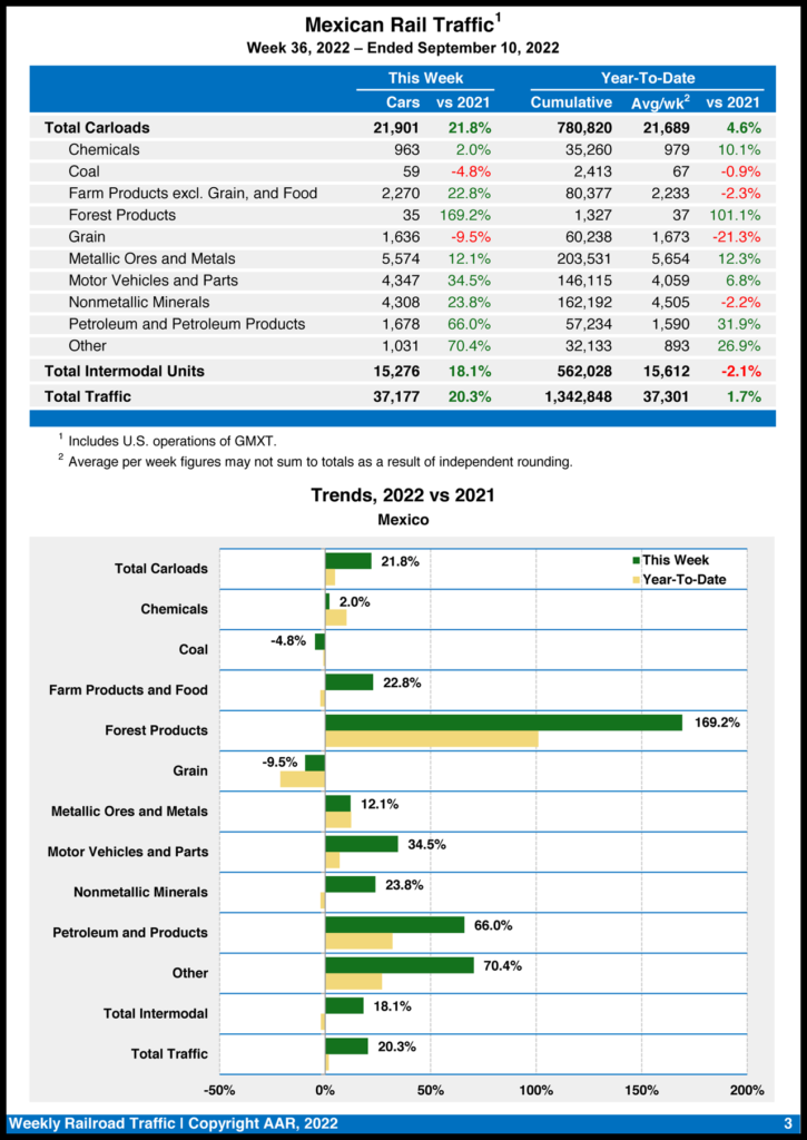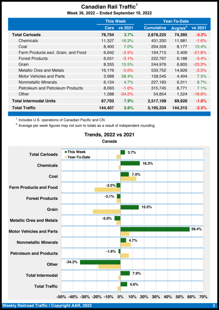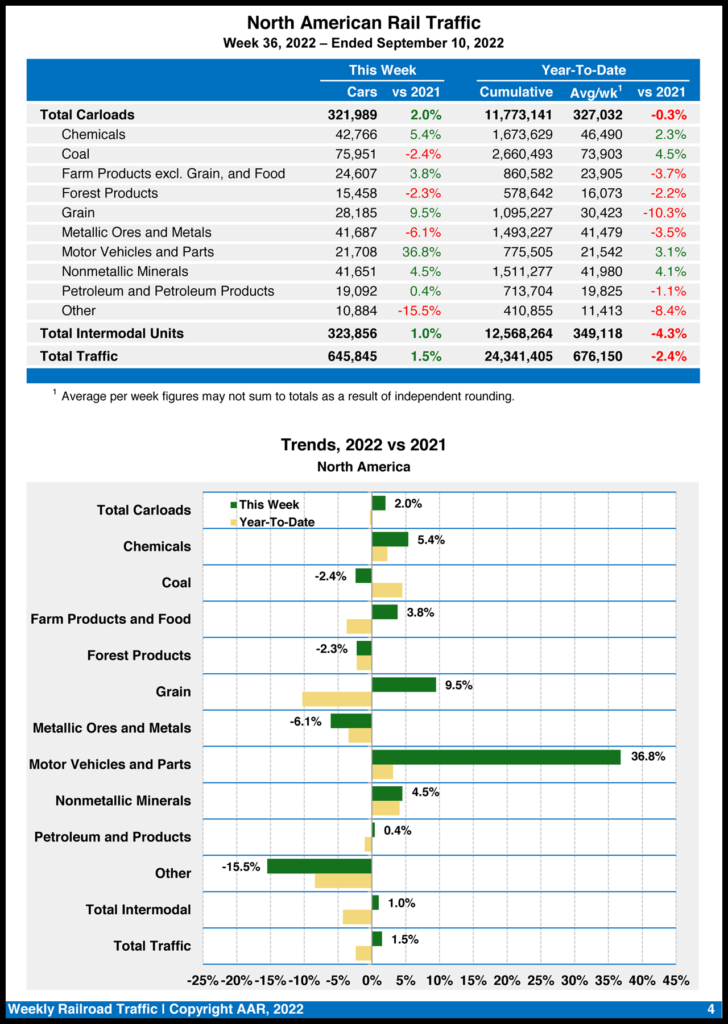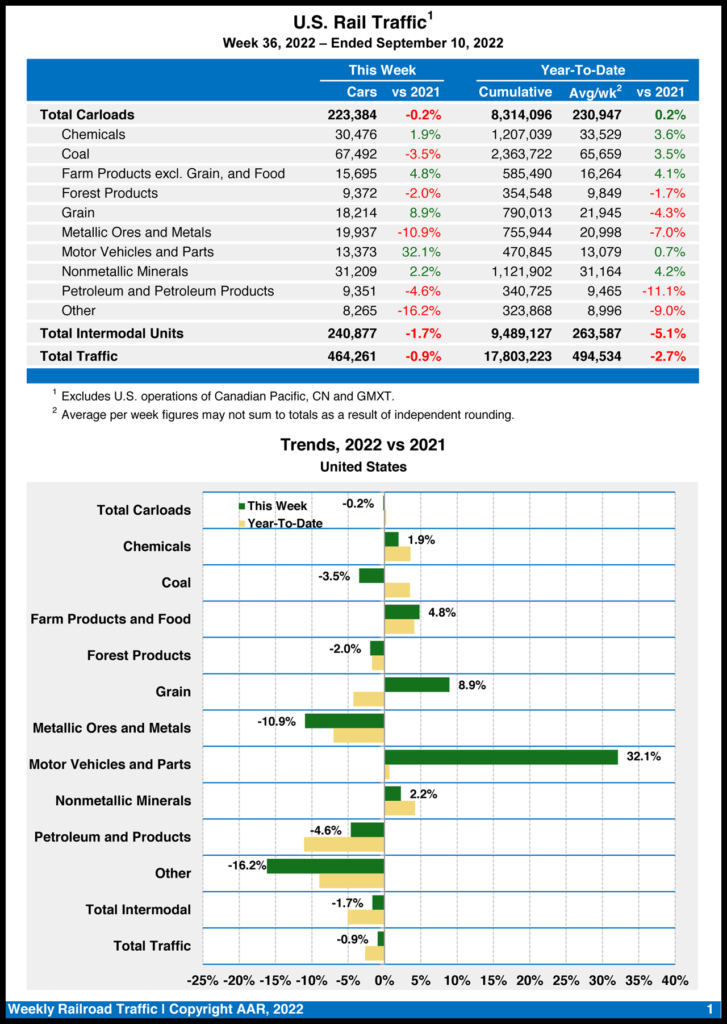 The Association of American Railroads (AAR) now has 36 weeks of traffic data for 2022 (ending Sept. 10). Total North American carload and intermodal traffic dipped 2.4% from the same point last year—with decreases in the U.S. and Canada, and an increase in Mexico.