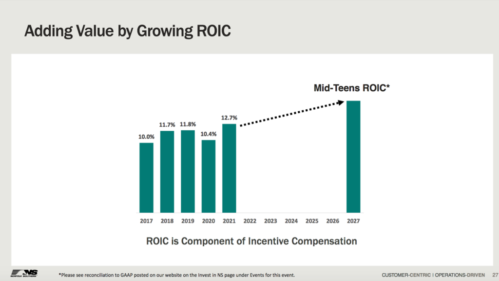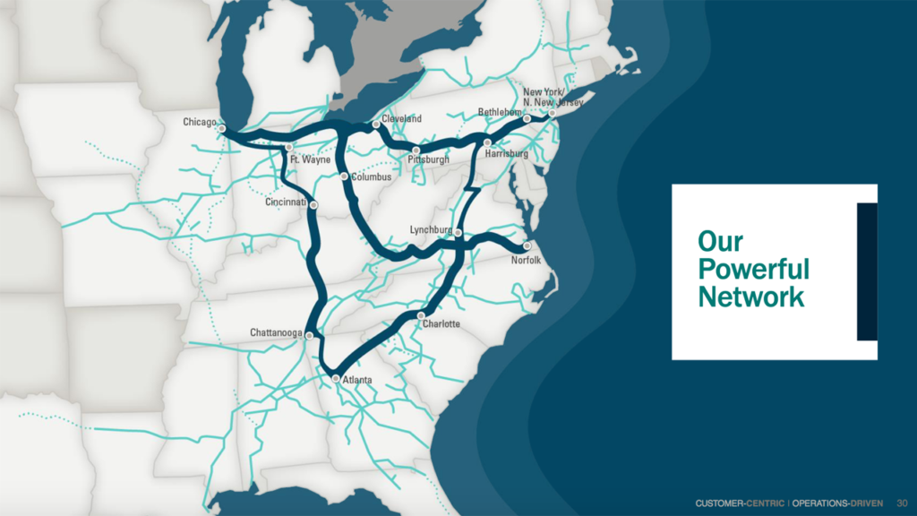 Shaw stressed that NS serves “dense population centers separated by moderate distances,” which positions it to compete for “flexible freight, business that can easily shift between highway and rail, the fastest-growing segment of the $860 billion U.S. truck and logistics market. That is what we mean when we say we have a franchise built for growth.”