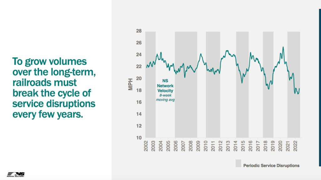 NS’s “slower network,” Shaw said, “costs us about $40 million a quarter in additional operating costs. It also means that we’re not participating in all the demand that’s out there for our customers. In the long term, that pattern of service disruptions erodes the confidence customers need to structurally choose rail over truck.”