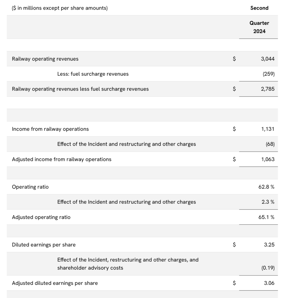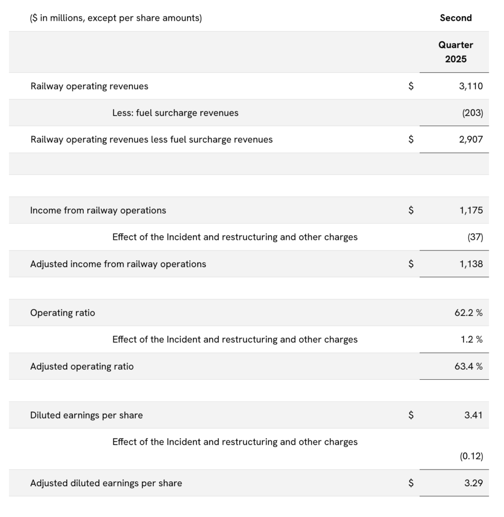 - Excluding the impact of fuel surcharge revenue, which was lower compared to the prior year, railway operating revenues were $2.9 billion, up $122 million, or 4% compared to adjusted second-quarter 2024.