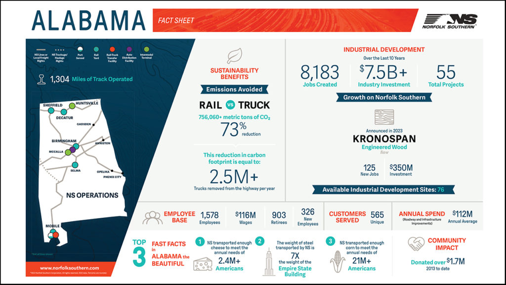 “We are grateful to Norfolk Southern for these investments in our state and for their support of our existing industries,” said Secretary of the Alabama Department of Commerce Ellen McNair. “This is proof that our open for business approach is attracting growth in our state among world-class businesses looking to locate or expand their operation. We look forward to the positive impact these enhancements will have on Alabama’s economic competitiveness and on the nation’s supply chain more broadly.”