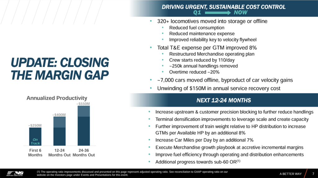 NS reported that “meaningful year-on-year margin improvement will be evident as we progress through the year.” It noted that “despite revenue and cost headwinds in the first quarter of 2024, we expect to deliver approximately 400-450 basis points of OR improvement during the second half of 2024.” The railroad said this is consistent with its plan to achieve approximately 100-150 basis points of average annual operating margin improvement, which translates to a 2024 exit ratio of approximately 64%-65%. Additionally, NS said that “despite pressure from lower volume, we remain committed to [the] OR guidance range due to additional cost take out.”