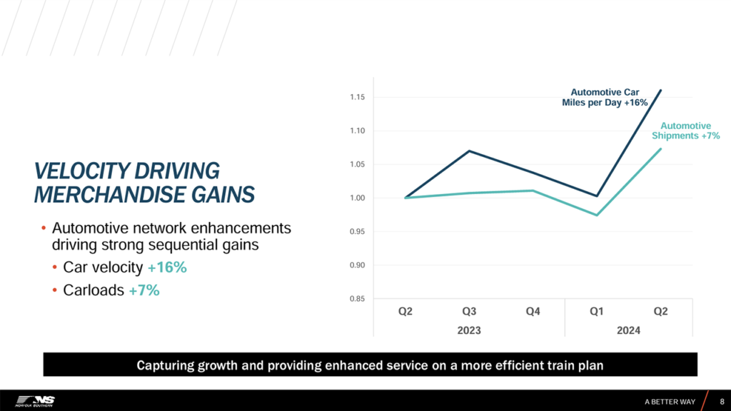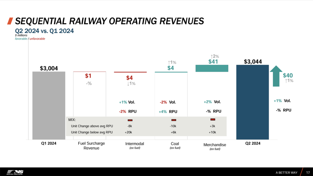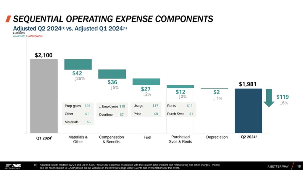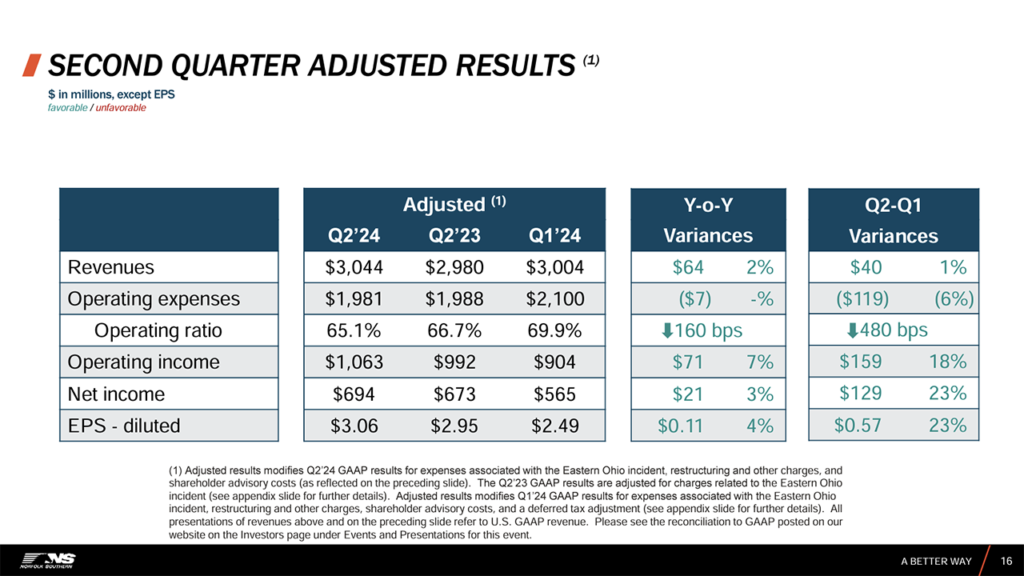 • OR was 62.8% vs. 80.7% in second-quarter 2023. On an adjusted basis, the OR for this year’s second quarter was 65.1%, which NS said represents 160 basis points of improvement from second quarter 2023, which was 66.7%.