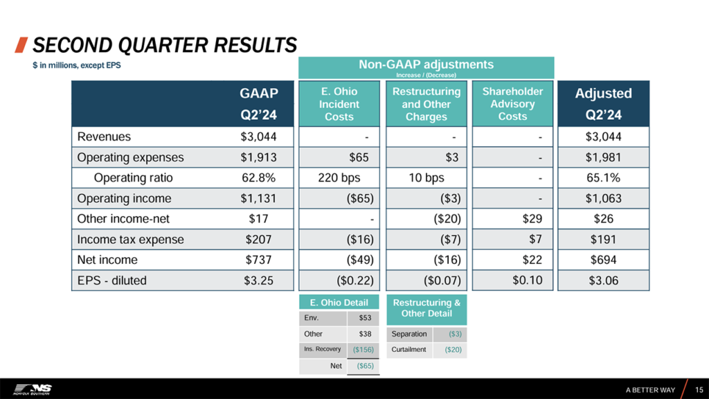 After adjusting its results to exclude the impact of the East Palestine, Ohio, derailment, restructuring and other charges, and shareholder advisory costs from the proxy contest, NS said that railway operating income was $1.1 billion, the OR was 65.1%, and diluted earnings per share were $3.06. “Notably, in the second quarter, the impact of the Eastern Ohio incident included insurance recoveries which were greater than the costs incurred in the quarter,” the railroad added.