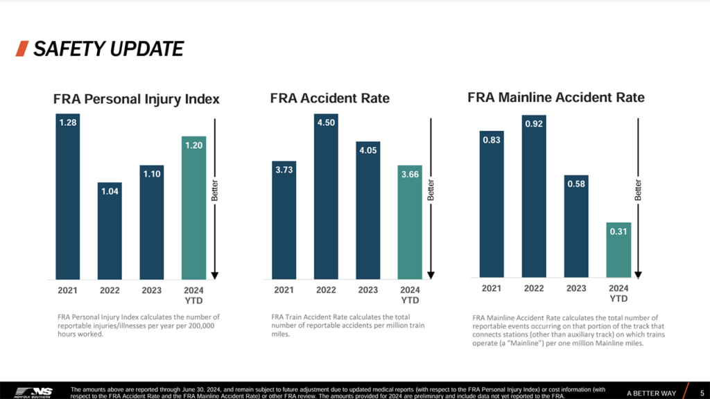 • Income from railway operations came in at $1.1 billion, an increase of $555 million, or 96%, compared with second-quarter 2023. Adjusting for the East Palestine derailment and restructuring and other costs, NS reported that income from railway operations was $1.1 billion, up $71 million, or 7%, compared with the same point last year.