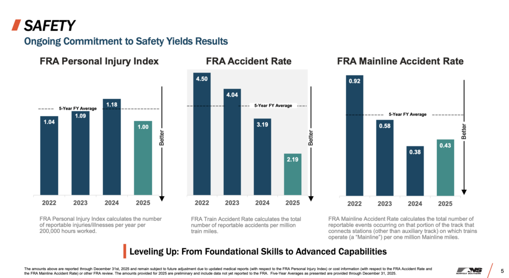 “In 2025, we strengthened the foundation of our railroad. We kept our cost commitments, maintained reliable service, and delivered measurable safety gains with the company’s best injury and accident rates in more than a decade,” Norfolk Southern (NS) President and CEO Mark George said during a fourth-quarter and full-year 2025 financial report.