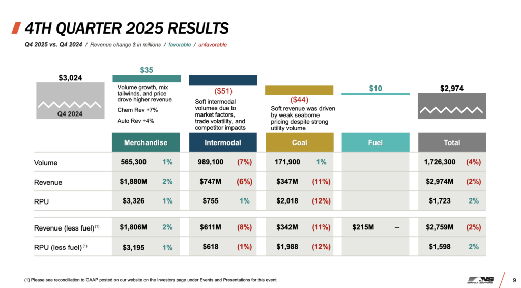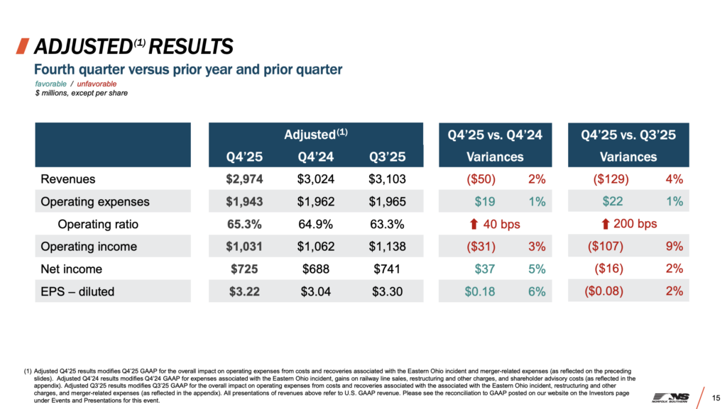 - Adjusting for: the effects of the Eastern Ohio incident in both years; merger-related expenses in 2025; and gains on railway line sales in 2024, income from railway operations was $1.0 billion, down $31 million, or 3%, compared to adjusted fourth quarter 2024.