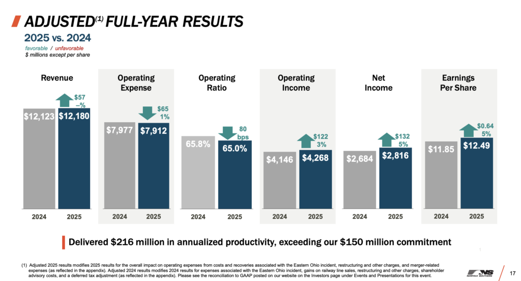 - Adjusting for the impact of merger-related expenses, restructuring and other charges, and the Eastern Ohio incident, the operating ratio for 2025 was 65.0%. This represents 80 basis points of improvement from adjusted 2024 which was 65.8%.