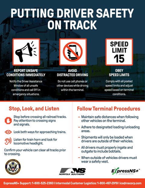 Safety on the terminal, NS says, is the first item the DRIVE Team will address. Whether it is in-gating, out-gating, or on-terminal activity, NS says it wants to help partner drivers execute their duties safely. To kickstart the safety campaign, the DRIVE Team created a flyer (below) with helpful instructions and reminders for the partner driver community. It is being disseminated to partner drivers across the Class I’s 22-state network.