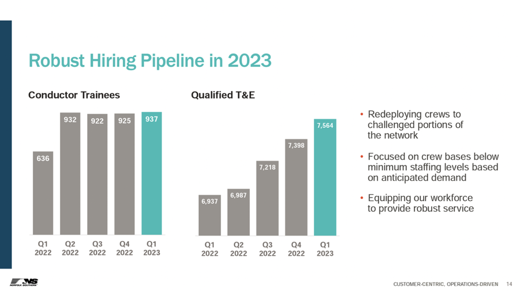 NS provided the following charts detailing its quarterly service, productivity and safety results as well as its hiring pipeline: