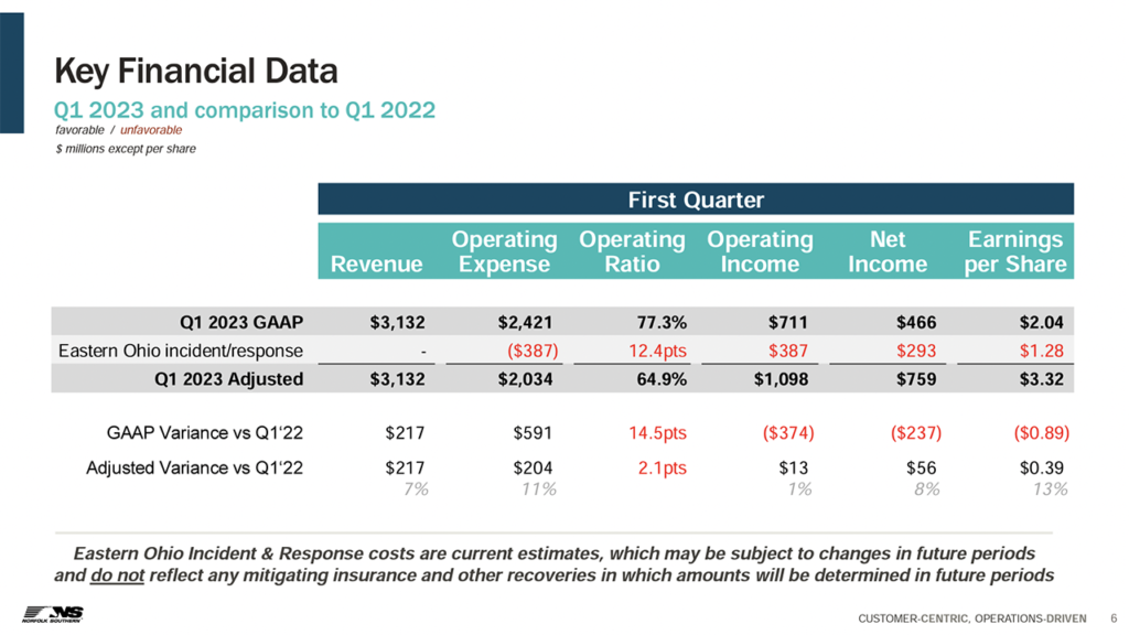 • Income from railway operations came in at $711 million and diluted earnings per share were $2.04, declines of 34% and 30%, respectively from first-quarter 2022, due to the derailment charge. Adjusting for the effects of the change, NS said, income from railway operations was $1.1 billion and diluted earnings per share were $3.32, improvements of 1% and 13%, respectively from 2022.