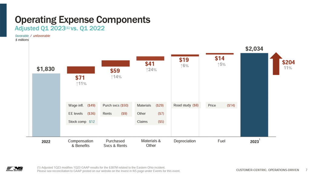 • “Inflationary costs remain elevated in the system and are expected to persist through 2023, pressuring FY OR. Management reiterated a commitment to preserve resourcing levels to optimize reliability, commenting that headcount will continue to increase sequentially throughout the year irrespective of the volume scenario. Purchased services and materials expenses recorded double-digit increases in the first quarter and should remain elevated in the second quarter due to the service problems created by the Ohio incident. Lastly, as we noted for the other U.S. railroads, fuel will be a headwind going forward. We worsen our out quarter OR assumptions to reflect these pressures.”