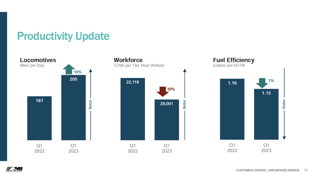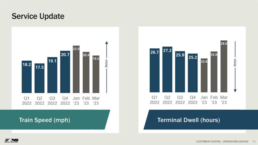 • “Service improvements became a casualty of the derailment in the first quarter with sequential worsening of fluidity metrics witnessed in February and March. East Palestine is located in an important corridor and is presently operating at reduced capacity. Normal operations on this line are expected to resume by June this year. NS also undertook a reassessment of train makeup procedures in the aftermath of the accident, resulting in near-term impacts on capacity provisions.