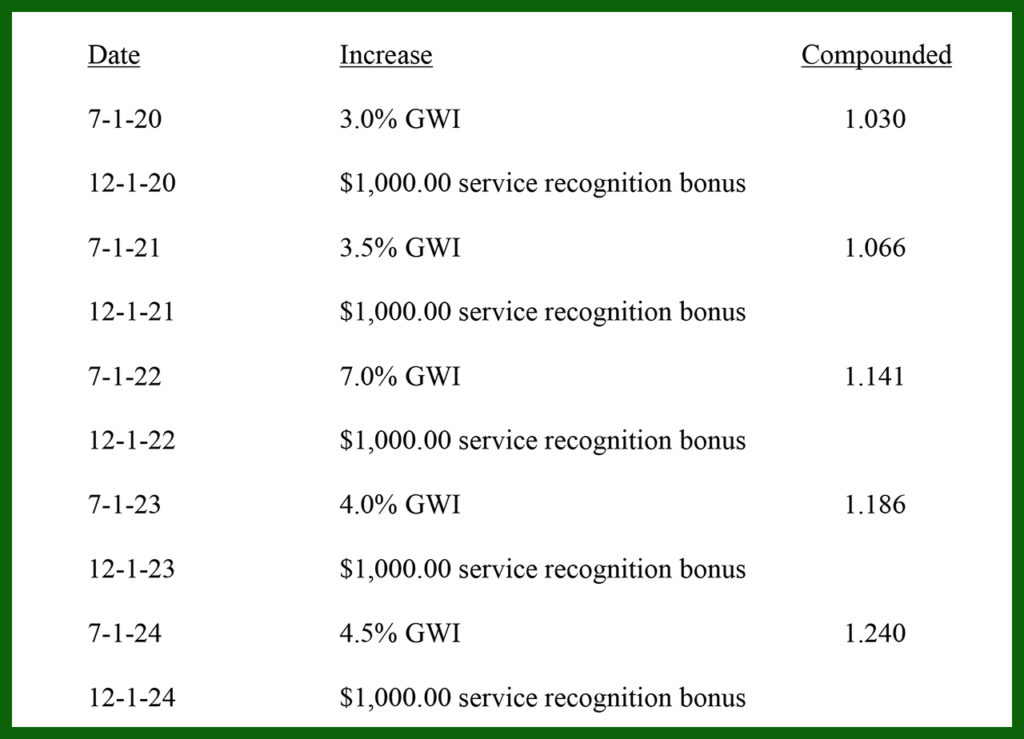 The National Carriers Conference Committee (NCCC), which represents the freight railroads in national collective bargaining, said, “The PEB’s recommendations would increase wages by 24% during the five-year period from 2020 through 2024, with a 14.1% wage increase effective immediately. The recommendations also include five annual $1,000 lump sum payments, adjustments to health care premiums, and limited changes to work rules. A portion of the wage increases and lump sum payments would be retroactive, resulting in more than $11,000 on average in immediate payouts to employees.