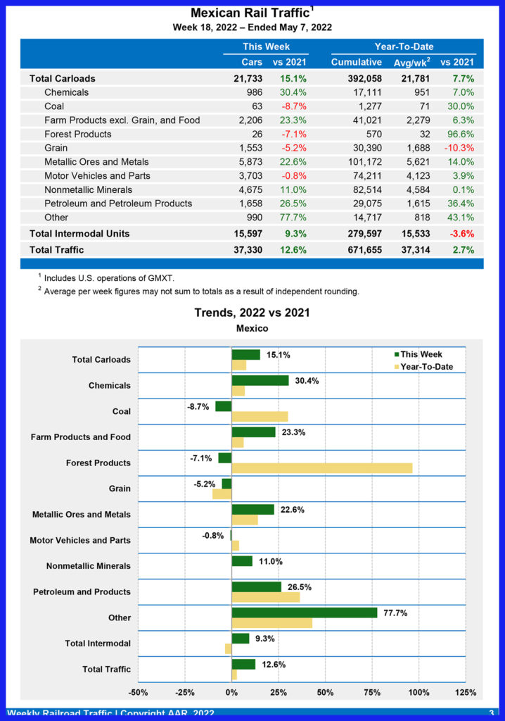 Mexican railroads reported 21,733 carloads for the week, up 15.1% compared with the same week last year, and 15,597 intermodal units, up 9.3%. Cumulative volume on Mexican railroads for the first 18 weeks of 2022 was 671,655 carloads and intermodal containers and trailers, up 2.7% from the same point last year.