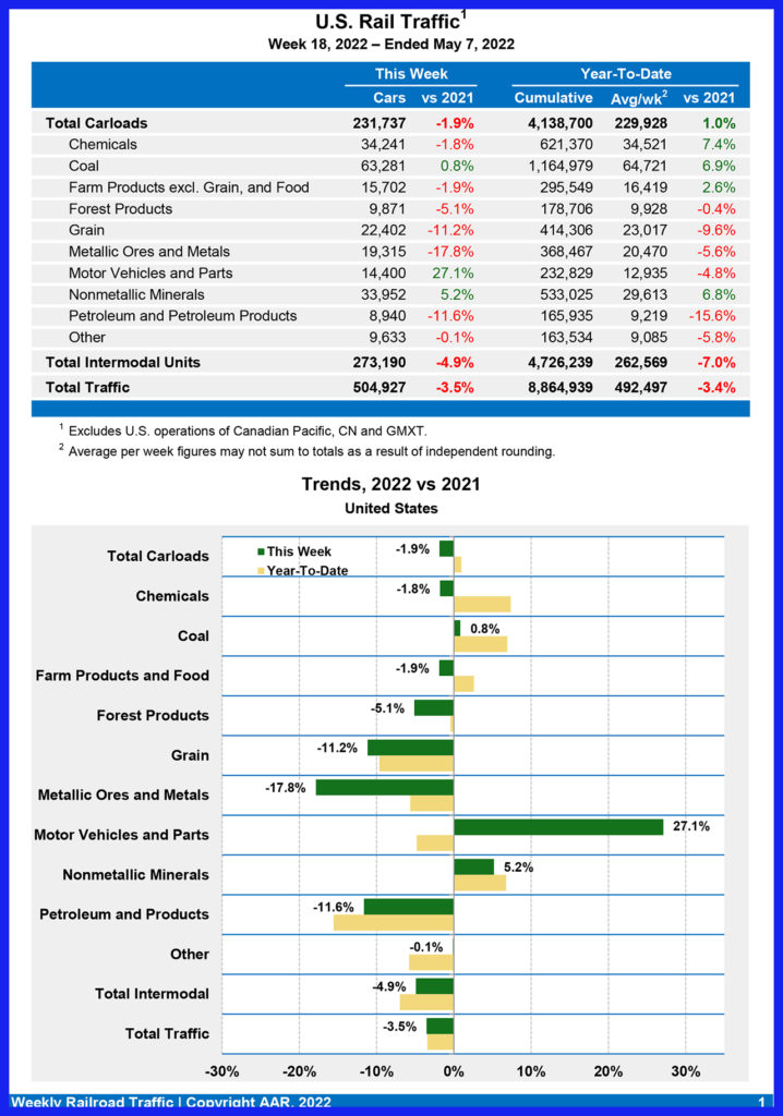 For Week 18, total U.S. weekly rail traffic was 504,927 carloads and intermodal units, down 3.5% compared with the same week last year. Total carloads were 231,737 carloads, down 1.9% compared with the same week in 2021, while U.S. weekly intermodal volume was 273,190 containers and trailers, down 4.9% compared to 2021.