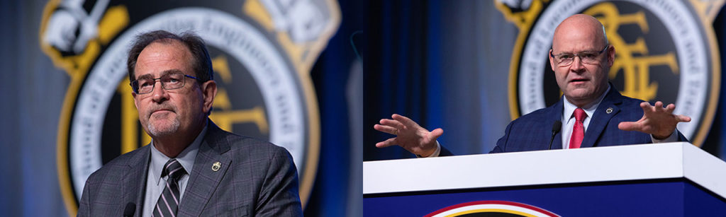 During the BLET’s National Convention in Las Vegas in mid-October, BLET President Dennis Pierce (above, left) stood beside Teamsters President Sean O’Brien (above, right), who identified railroads “as the true enemy.” Ignored were non-union owner-operator truckers whose meager earnings make possible a rail-job-threatening hijacking of intermodal.
