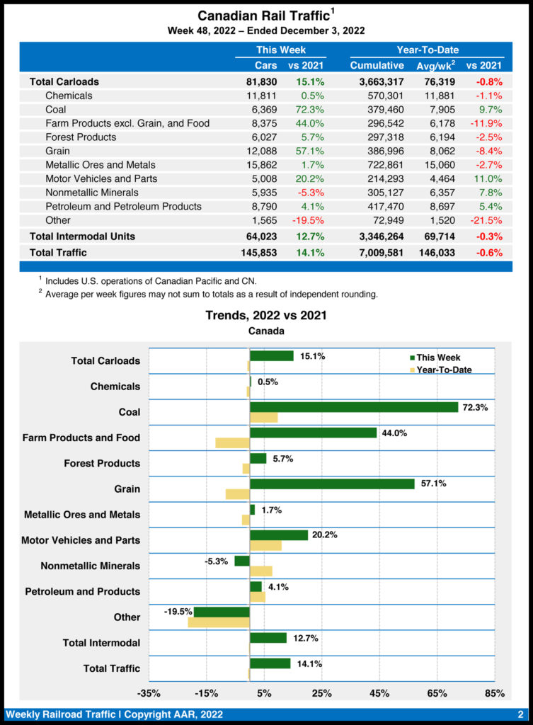 Canadian railroads reported 81,830 carloads for the week ending Dec. 3, 2022, a 15.1% boost, and 64,023 intermodal units, a 12.7% gain over the same week in 2021. For the first 48 weeks of this year, they reported cumulative rail traffic volume of 7,009,581 carloads, containers and trailers, down 0.6%.