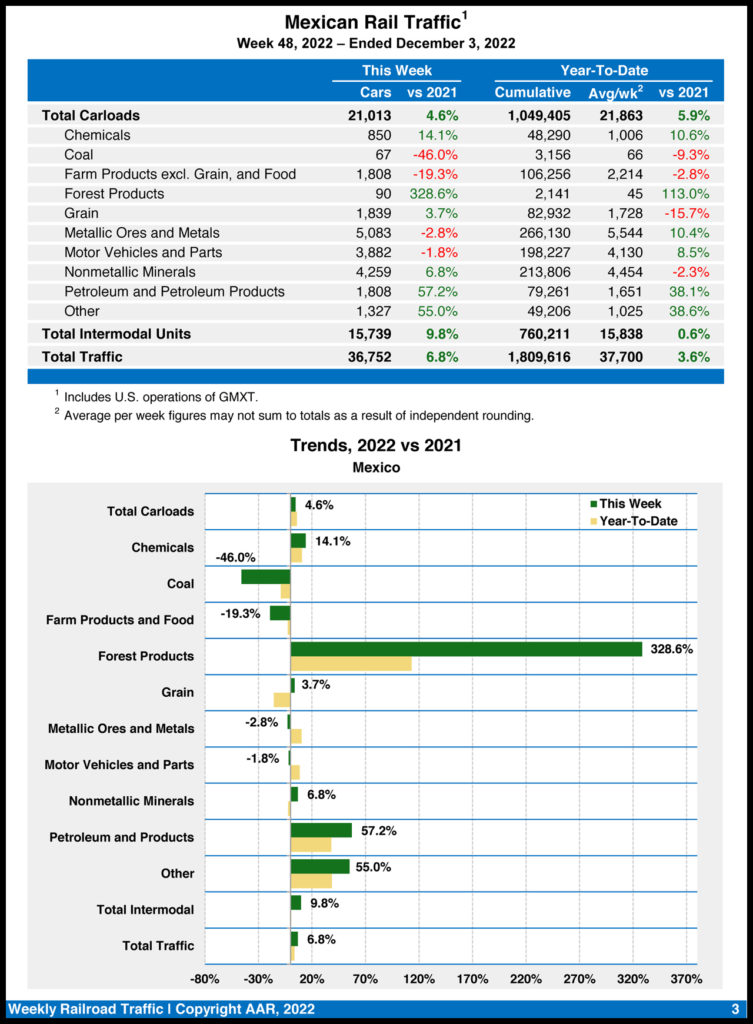 Mexican railroads reported 21,013 carloads for the week ending Dec. 3, 2022, rising 4.6% from the same week last year, and 15,739 intermodal units, increasing 9.8%. Their cumulative volume for the first 48 weeks of 2022 came in at 1,809,616 carloads and intermodal containers and trailers, up 3.6% from the prior-year period.