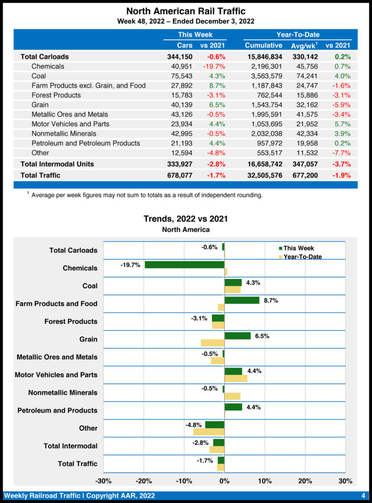 In reporting U.S. rail traffic for the week ending Dec. 3, 2022, and volumes for November 2022, AAR Senior Vice President John T. Gray said, “As has been the case for months, some sectors continue to show strength while others face headwinds.”