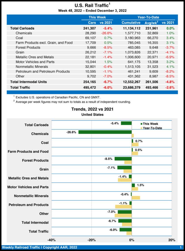 Total combined U.S. traffic for the first 48 weeks of 2022 was 23,686,379 carloads and intermodal units, a 2.6% decrease from 2021.