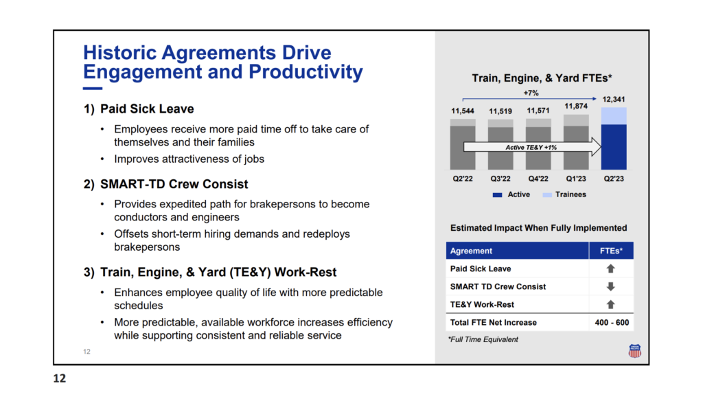 Going forward, Vena told investors that UP will also be focused on “attracting new business and boosting rates to cover higher costs” like the raises and sick leave the Class I agreed to give workers over the past year to address some of their quality of life concerns, according to the AP report. “Both those things will also help the bottom line,” Vena said.