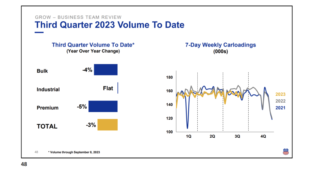 But, AP reports, “The current weak consumer demand amid the uncertain economy and inflation has translated into a 3% drop in volume so far in the third quarter, even though most industrial shipments have remained steady,” putting pressure on UP’s profits.