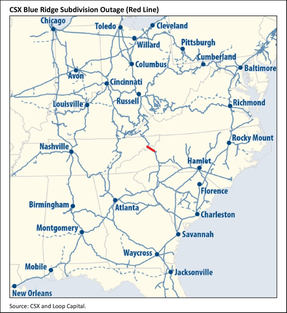 Regarding Norfolk Southern, its track actually runs through Asheville, and the outage here is the only remaining one on NS’s network. We don’t have any more information than that. Next week’s operating metrics for CSX and NS will no doubt be ugly (only one day of the storm was captured in the latest data, through the week ending Sept. 27), but what matters is always recoverability. We suggested a one-week storm impact followed by two weeks of recovery to clear backlogs and spin the networks up, but given the scope of Helene that’s probably a best-case scenario.