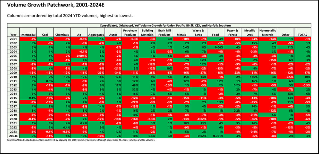 The STB hearing on U.S. Class I volume growth—or lack thereof—shined a spotlight on this important issue, and before that spotlight fades and we get back to the business of not growing, we were interested in coming up with a visual representation of the problem. The patchwork below shows consolidated annual volume growth for Union Pacific, BNSF, CSX, and Norfolk Southern so far this century, by 16 product categories. The categories are ordered from highest to lowest 2024 YTD volumes, left to right: